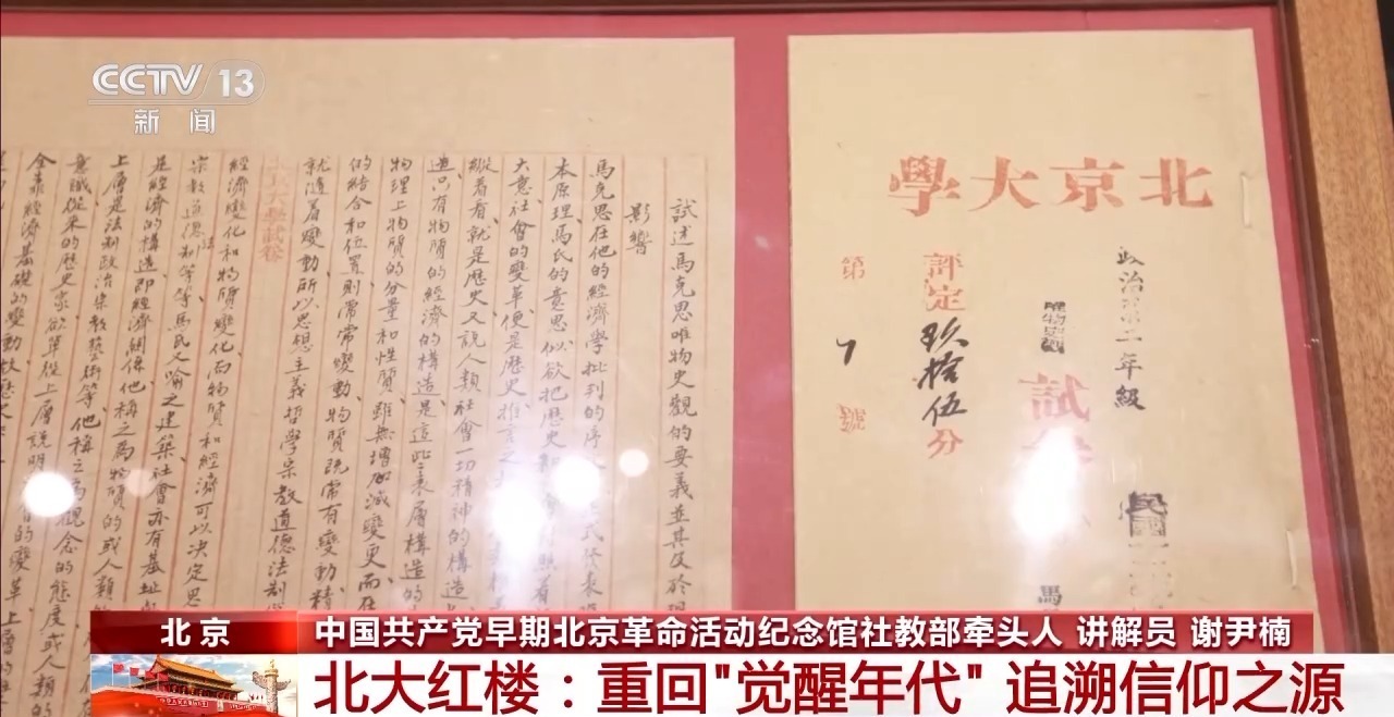 中国共产党早期北京革命活动纪念馆社教部牵头人 讲解员 谢尹楠:这个是100多年前学生的试卷,当时李大钊批阅北大哲学系学生唯物史观的试卷,他也是中国最早将马克思主义引进中国高校课堂、引进试卷的人,在封面上可以看到学生们都得到了不错的成绩。
