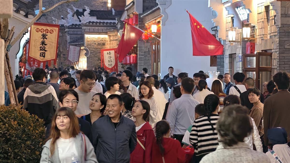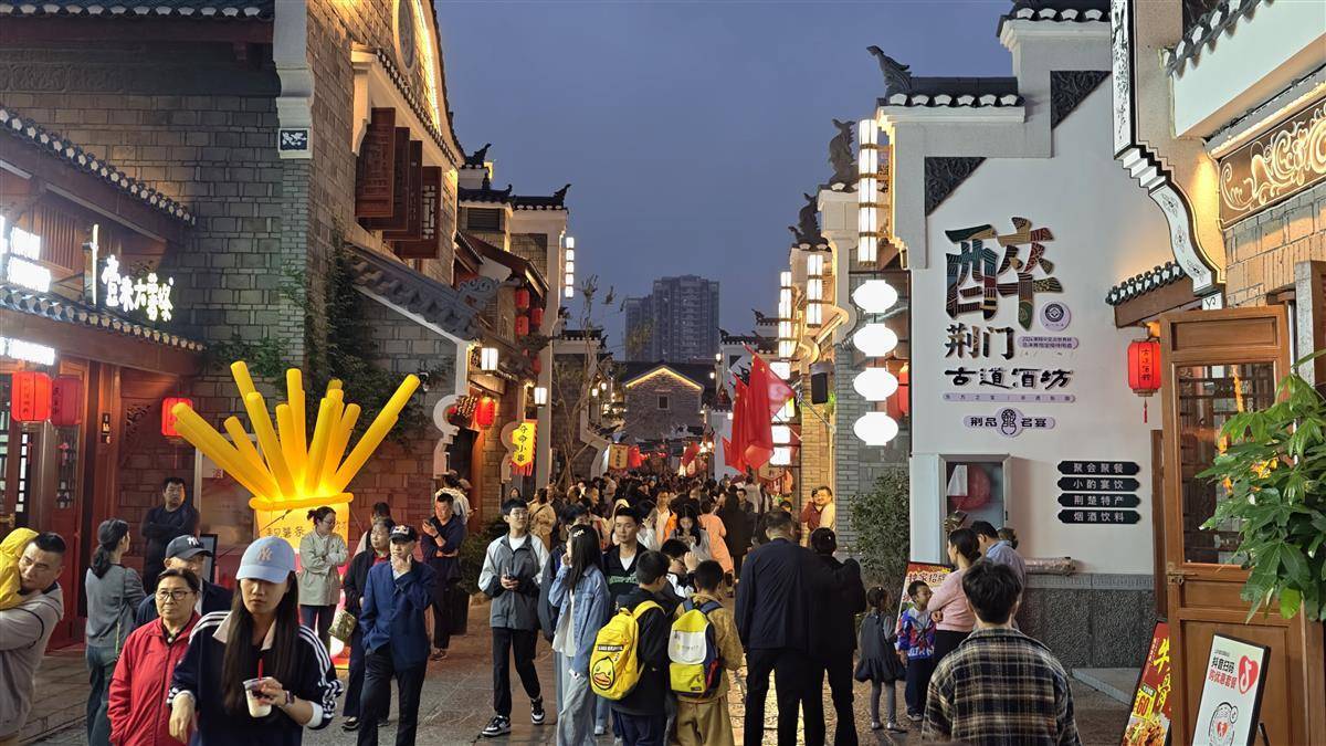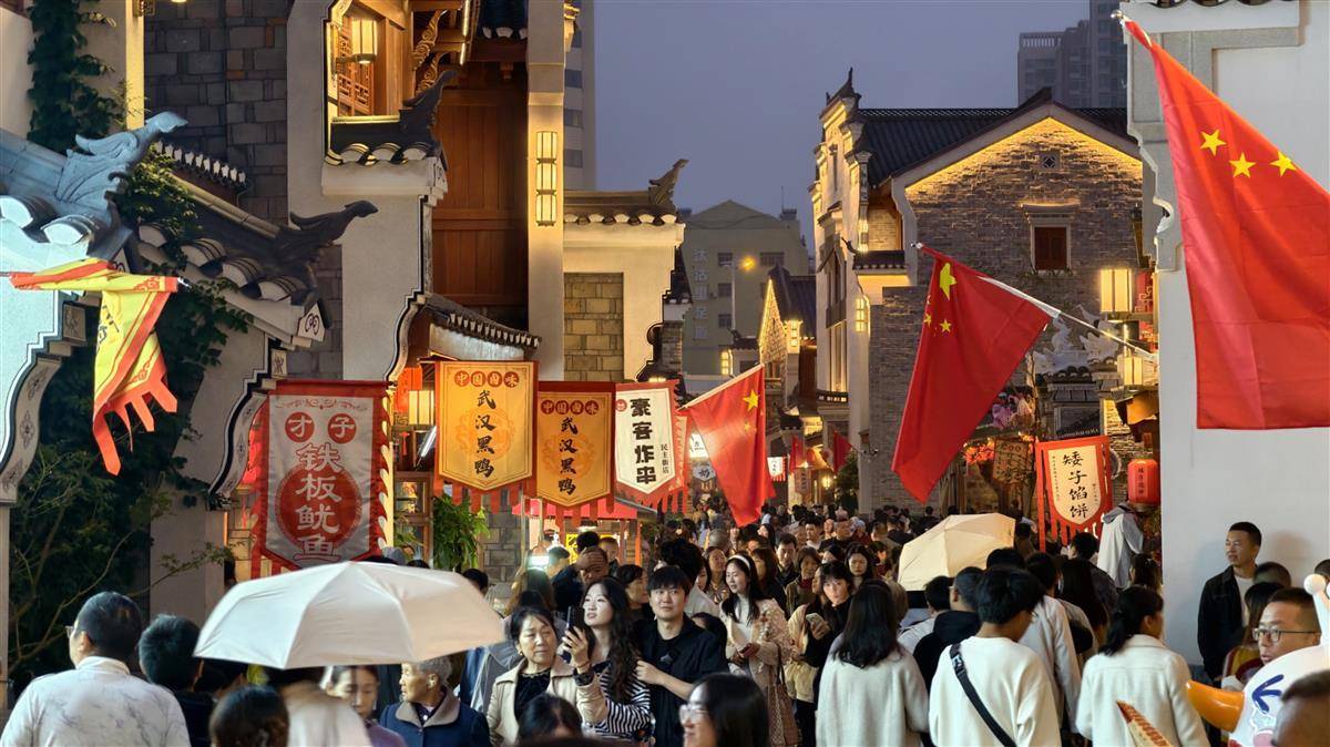 10月3日晚,荆门民主街历史文化街区灯火通明,青石板路上人潮如织,南桥包子、矮子馅饼等本土老字号门店前排起长队。烟火气点亮城市夜空,成为荆门夜间经济新引擎。 (湖北日报全媒记者 陈少哲 摄)