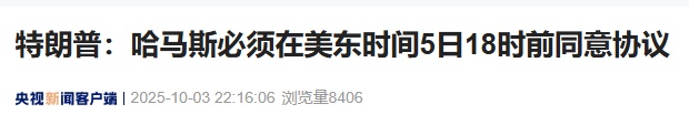 当地时间10月3日,美国总统特朗普在社交媒体“真实社交”上发文表示,哈马斯必须在美东时间10月5日18时前同意协议。如果这项协议无法达成,哈马斯“将遭受前所未有的地狱般的打击”。
