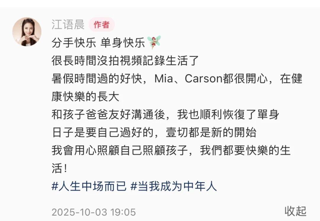 江语晨发文称,分手快乐,单身快乐。很长时间没拍视频记录生活了,暑假时间过的好快,Mia、Carson都很开心,在健康快乐的长大,和孩子爸爸友好沟通后,我也顺利恢复了单身日子,是要自己过好的,一切都是新的开始。我会用心照顾自己照顾孩子,我们都要快乐的生活!