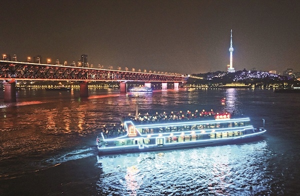 国庆期间,武汉两江四岸灯火璀璨,夜色尽显壮美。入夜,江城十余艘游船穿梭江面,满载八方宾客开启长江夜游之旅。游客沐浴江风,欣赏流光溢彩的灯光与城市地标交相辉映的景致,沉浸式感受江城夜晚的独特魅力。