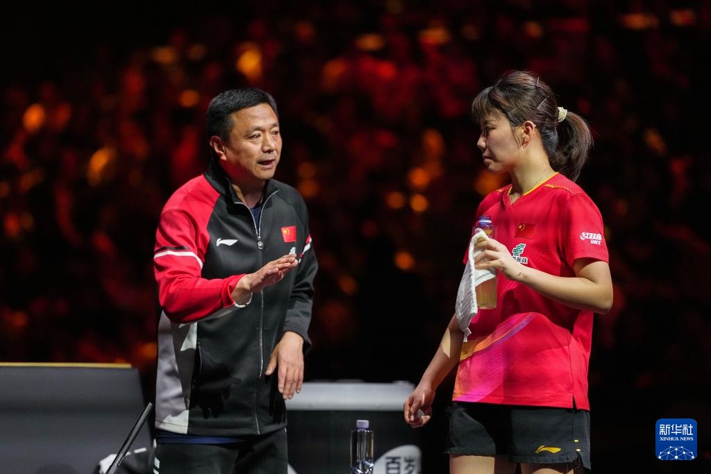 10月3日,陈幸同(右)在比赛中与教练交流。