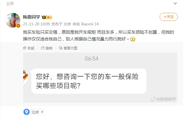 另据三湘都市报记者查询发现,陈震2023年曾在微博发文称自己买车险只买交强险,原因是自己开车规矩而且车多,所以买车损险不划算。