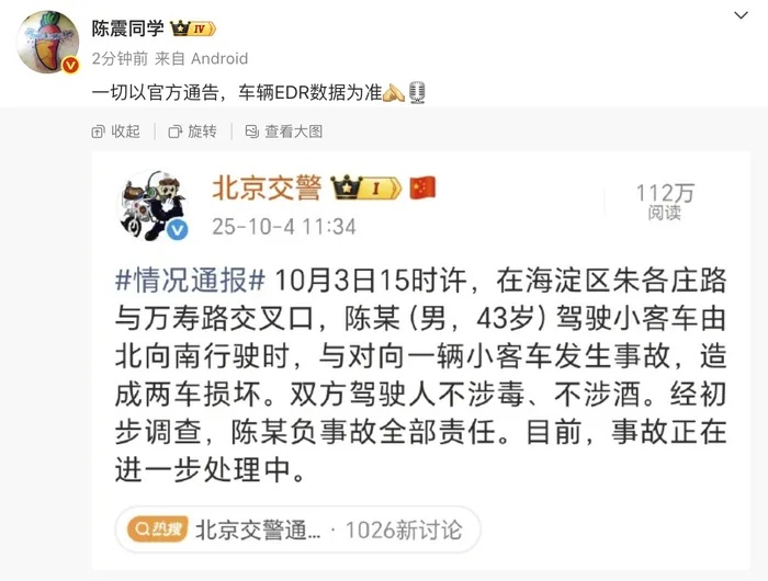 10月4日,在驾驶劳斯莱斯出车祸被警方通报后,知名车评人陈震发文道歉:“我都看到了,是我的问题,一切负面照单全收,全力配合解决问题中,不会有丝毫懈怠,事故经过以官方公告、车辆EDR数据为准,造成了这么大的负面影响,在此向对方车辆道歉,向大家道歉……”