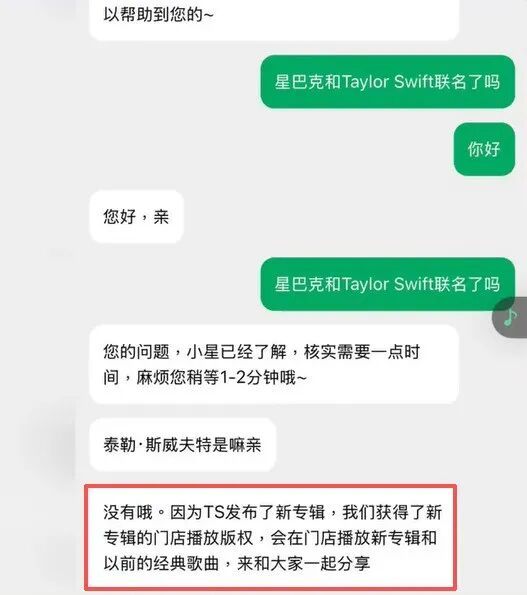 @读秒财经 询问了星巴克官方客服,对方表示,“没有哦。因为Taylor Swift发布了新专辑,我们获得了新专辑的门店播放版权,会在门店播放新专辑和以前的经典歌曲,来和大家一起分享。”