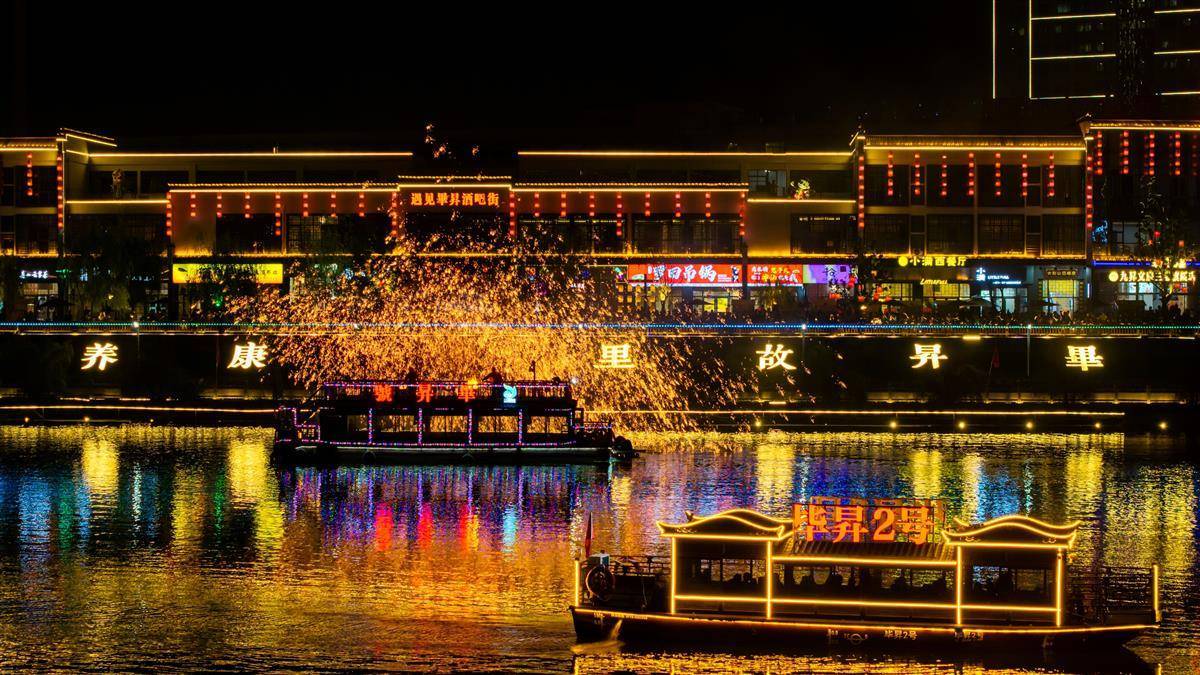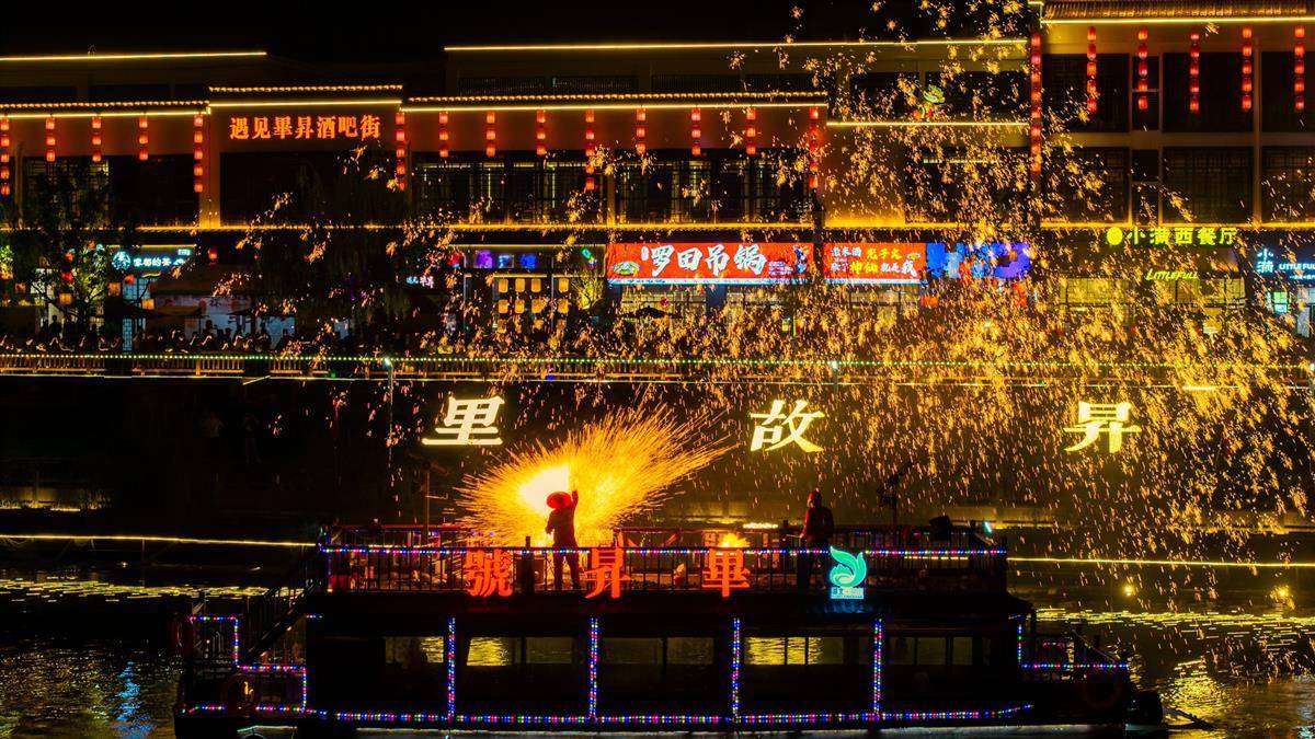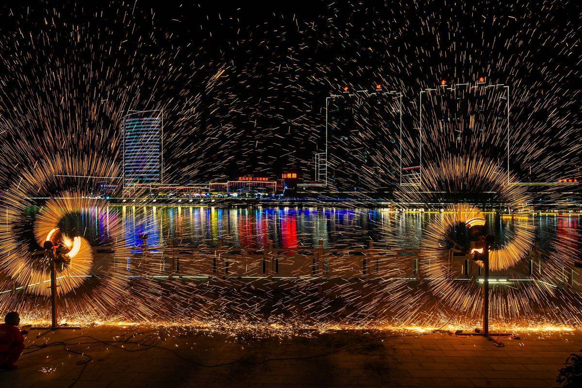 10月1日,英山县温泉镇“夜游英山”景区,上演精彩的打铁花等非遗表演活动,吸引了大量市民和游客前来观赏,营造出浓郁的节日氛围。
