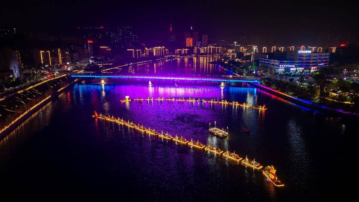 10月3日,黄冈市英山县温泉镇一河两岸“夜游英山”景区灯光璀璨,吸引了大量市民和游客前来观赏,尽享美好假期时光。(视界网 王江 摄)