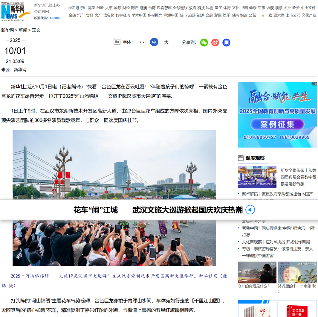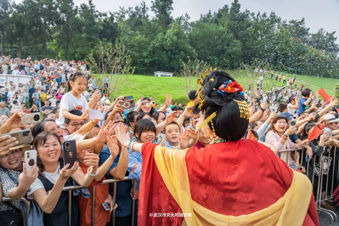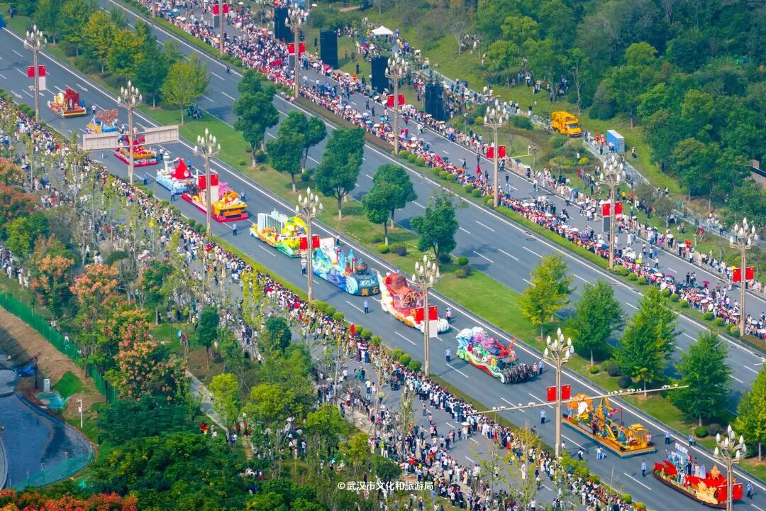 10月1日上午,由武汉市人民政府、湖北省文化和旅游厅主办,武汉市文化和旅游局、武汉东湖新技术开发区、湖北广播电视台承办的2025“河山添锦绣”武汉文旅IP城市大巡游活动,在武汉高新大道盛大举行。