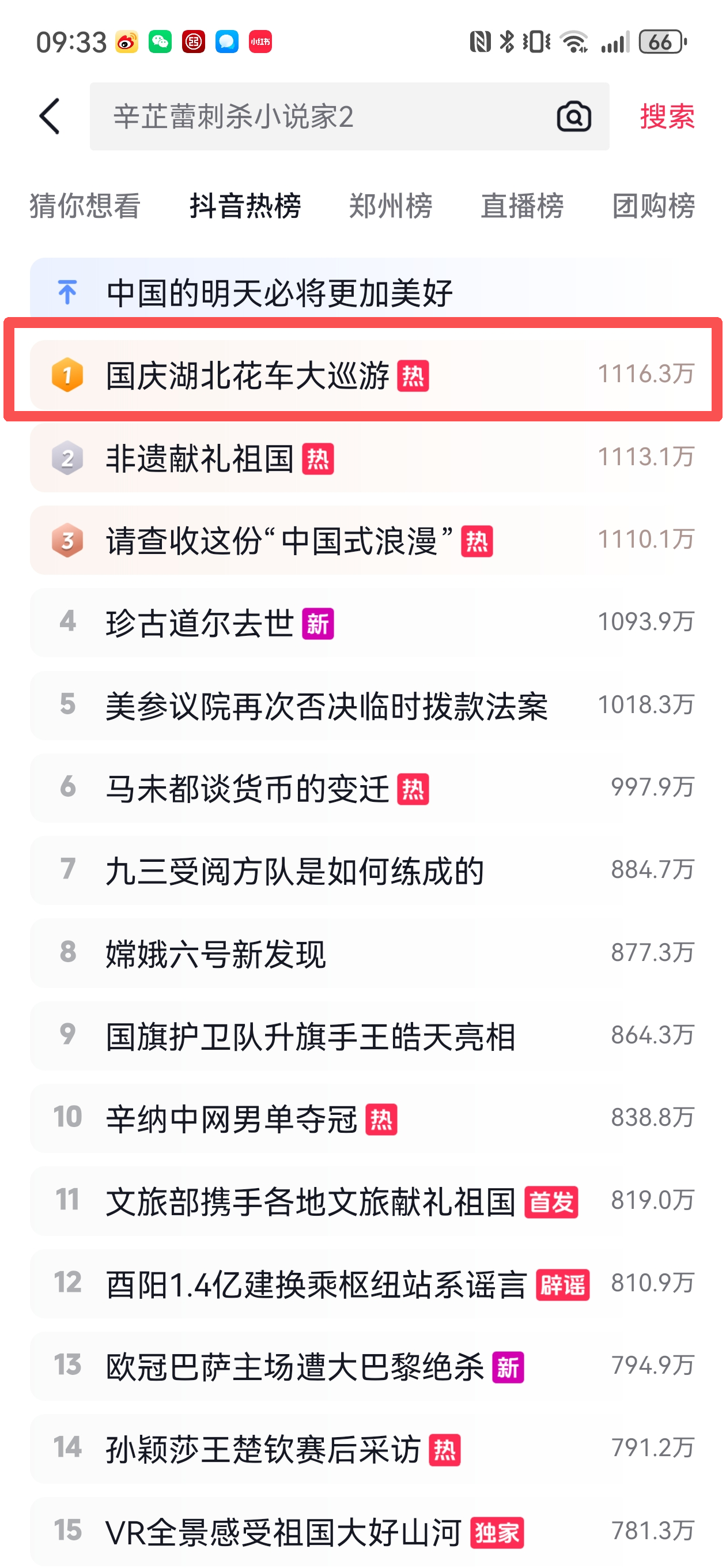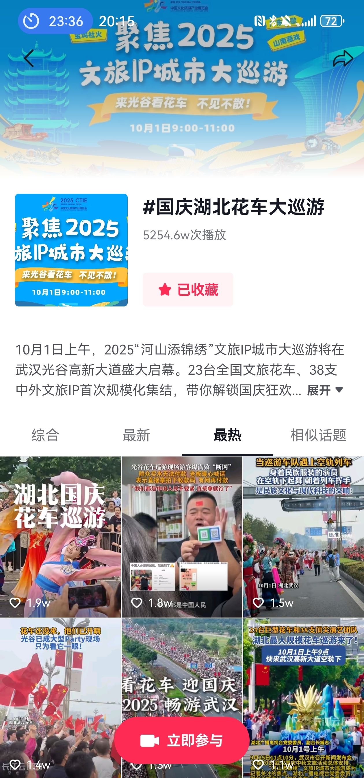 此外,抖音话题#国庆湖北花车大巡游#阅读量超4261万,占据抖音热搜全国总榜第一位超过24小时,#国庆湖北花车大巡游后续来了#、#香港驻汉办主任点赞湖北花车巡游#等相关话题持续占据抖音武汉热榜前五。