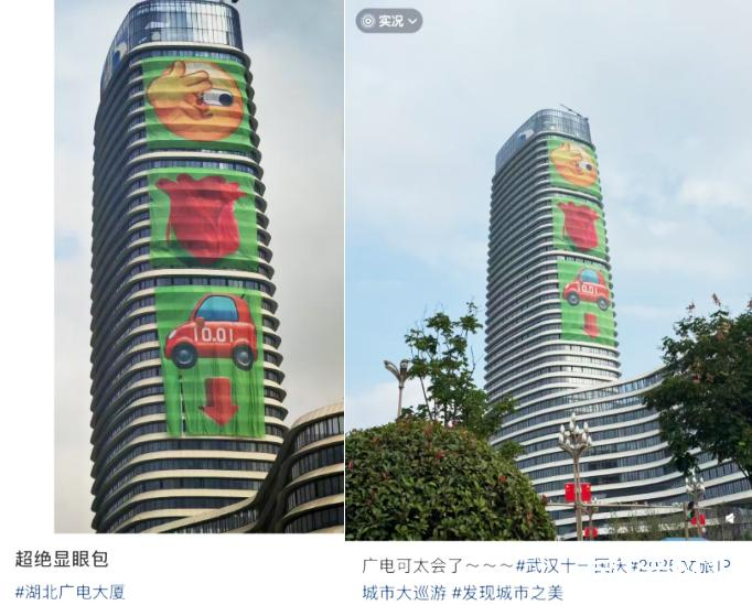 活动还没开始,就先吸引了一波流量。活动前连续三天,湖北广电传媒大厦外立面陆续推出“让我看看”“玫瑰”“汽车”三张巨幅表情海报,配合《快看,光谷东出现了巨型表情包!》等悬念式推文,吊足了网友的好奇心:“这不是‘看花车’嘛”“湖北文旅会玩、懂年轻人!”微博相关话题#武汉光谷东第一高楼出现巨型表情包#登上武汉热榜。