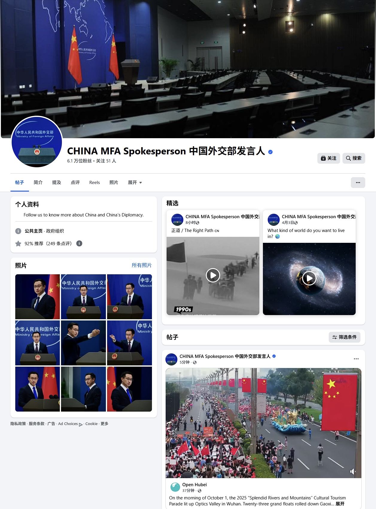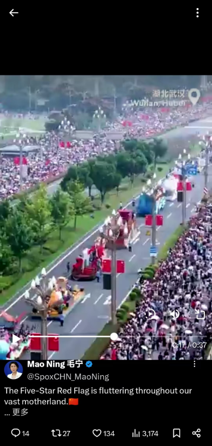 中国外交部官方头部账号“中国外交部发言人”、外交部新闻司司长毛宁账号,均多次向全球发布花车巡游的盛大场景。“官方天团”集体推介,巡游活动全球传播。