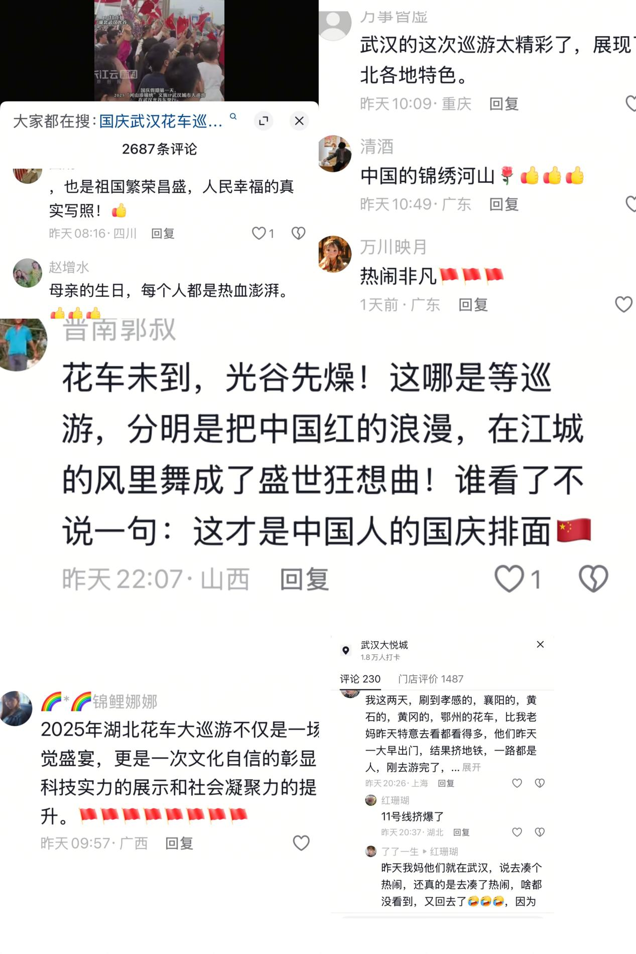 网友纷纷发帖感叹“今天的光谷感觉来了一亿人”“今天的武汉比过年还热闹!”“武汉知道自己火出圈了吗?”还有不少网友询问“活动还要办几天?”“后面还有机会看到花车吗?”……