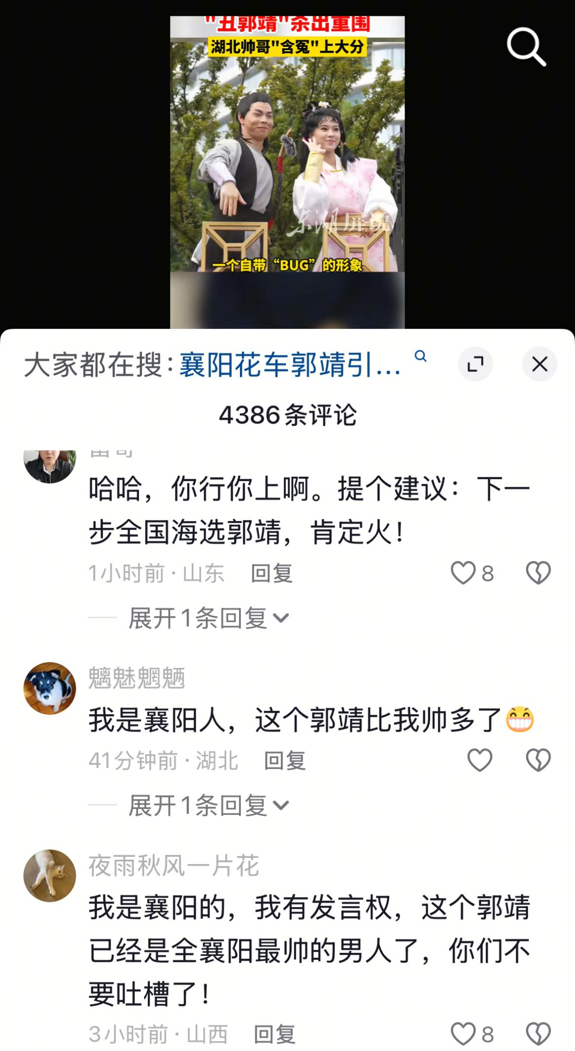巡游还没结束,抖音爆款不断。“国庆湖北花车大巡游 扛起女友让她看个够”“穿尿不湿 骑肩膀 坐怀里 武汉小奶娃们看花车巡游萌翻全场”等短视频瞬间刷爆!其中,关于襄阳花车“郭靖”扮演者“丑出圈”的话题迅速冲上热搜,引发网友集体“炸锅”。