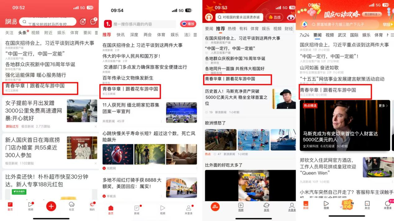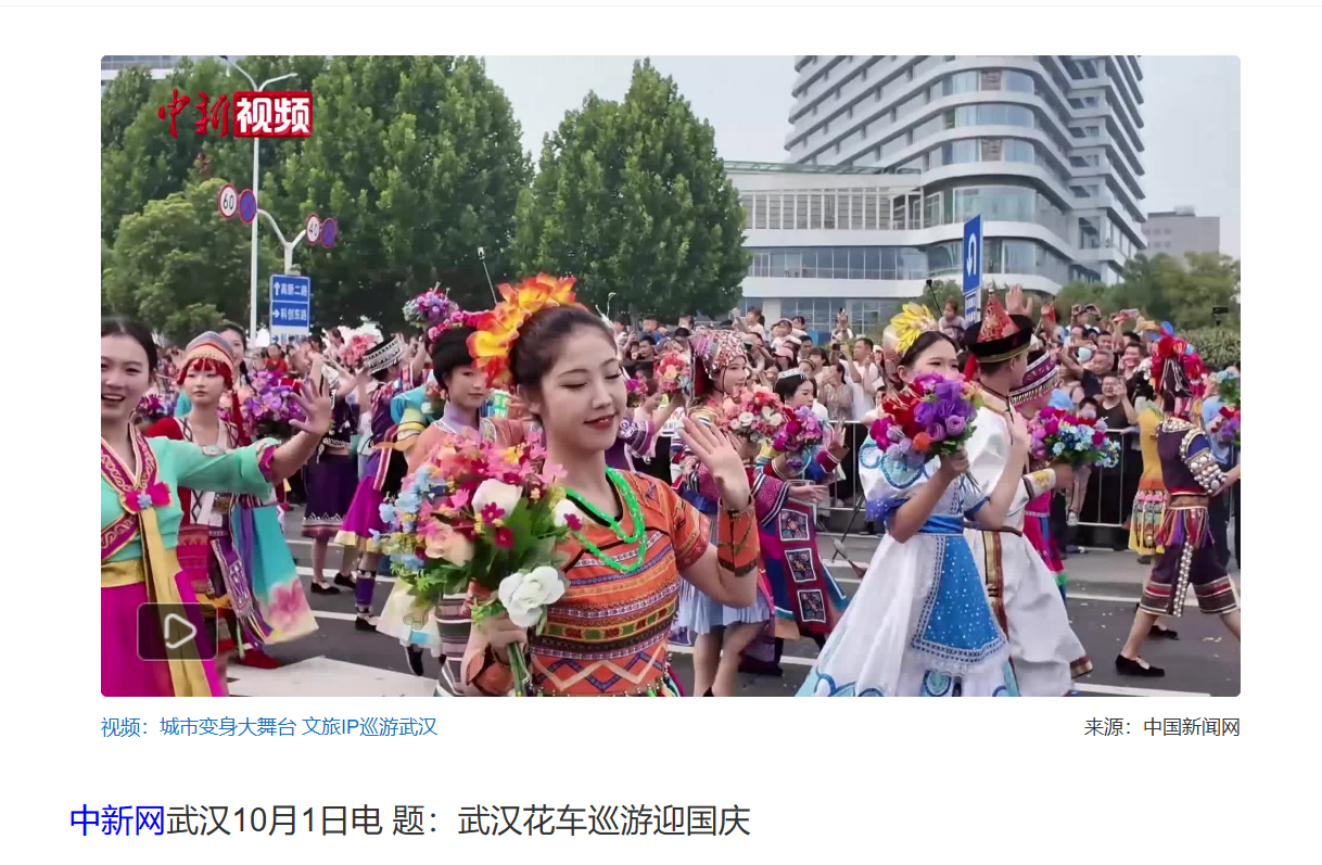 10月1日,央视《新闻联播》的《欢度国庆 祝福祖国》节目中,“武汉花车大巡游”作为开篇场景出现,被大篇幅重点报道,实现首日传播的“顶点曝光”;当天《新闻直播间》《中国新闻》先后单条报道。