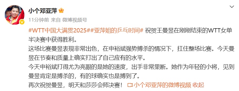 祝贺王曼昱在刚刚结束的WTT女单半决赛中获得胜利。