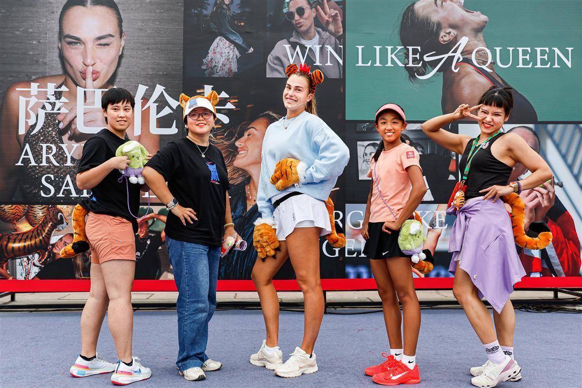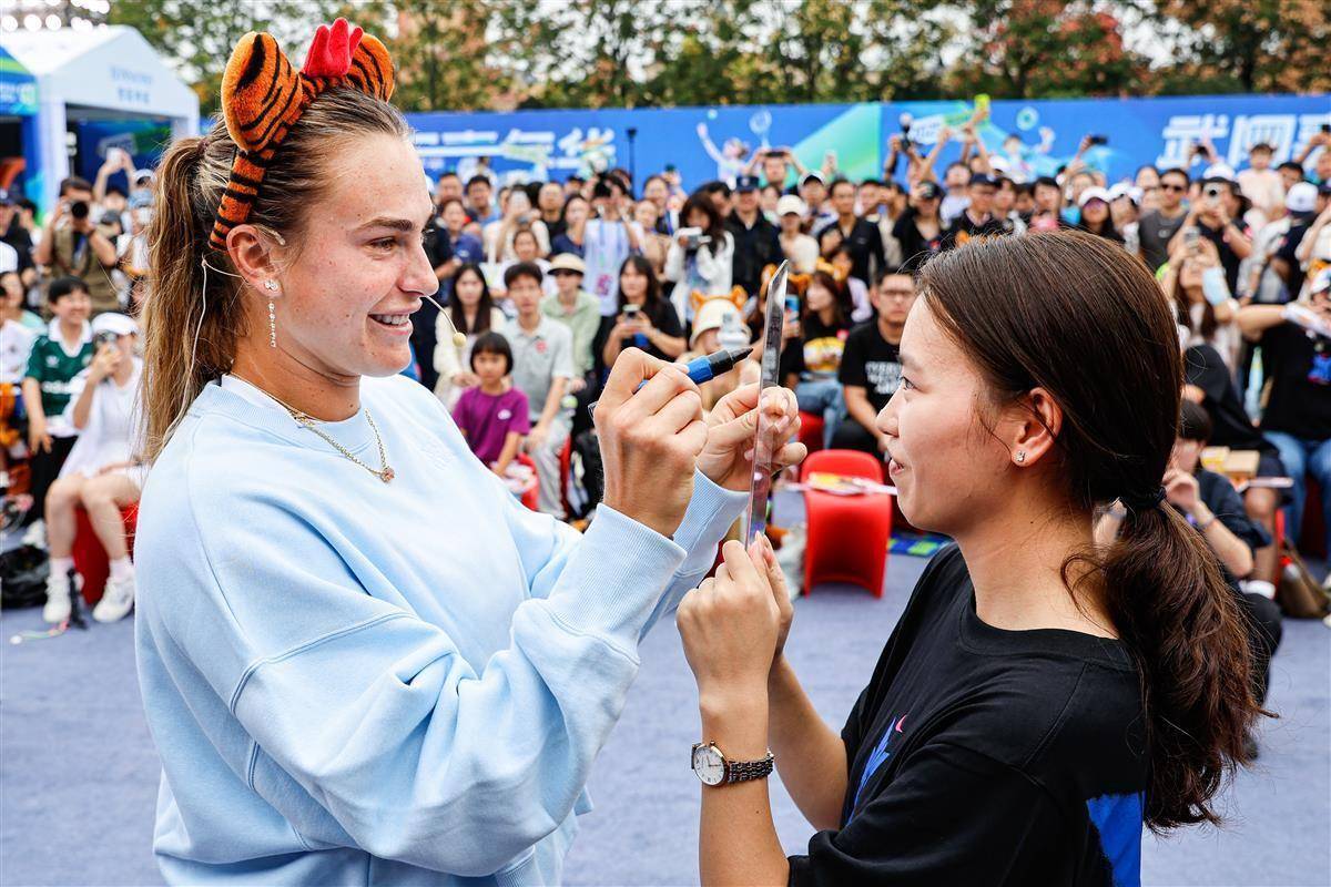 10月4日下午,“虎妞”萨巴伦卡现身武网嘉年华广场,并佩戴老虎造型的头饰与粉丝互动。(湖北日报全媒记者 任勇 摄)