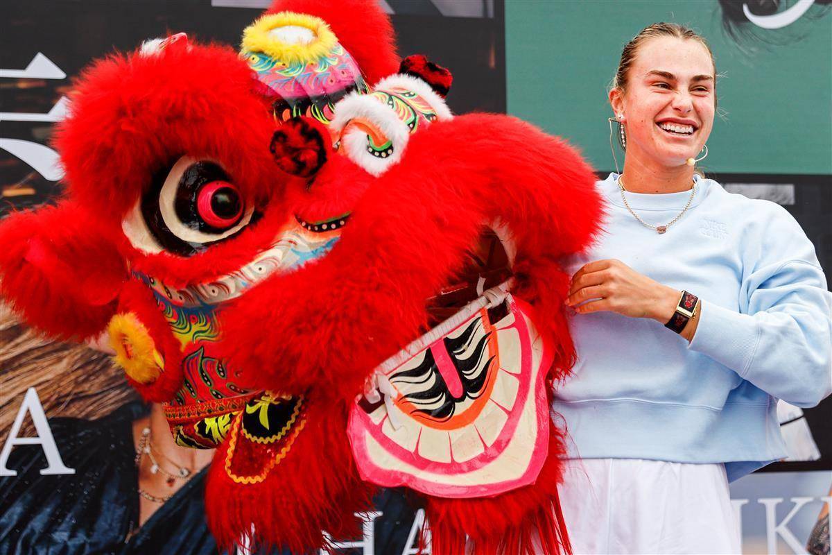 10月4日下午,武网“三冠王”萨巴伦卡现身武网嘉年华广场,现场体验非遗舞狮。(湖北日报全媒记者 任勇 摄)
