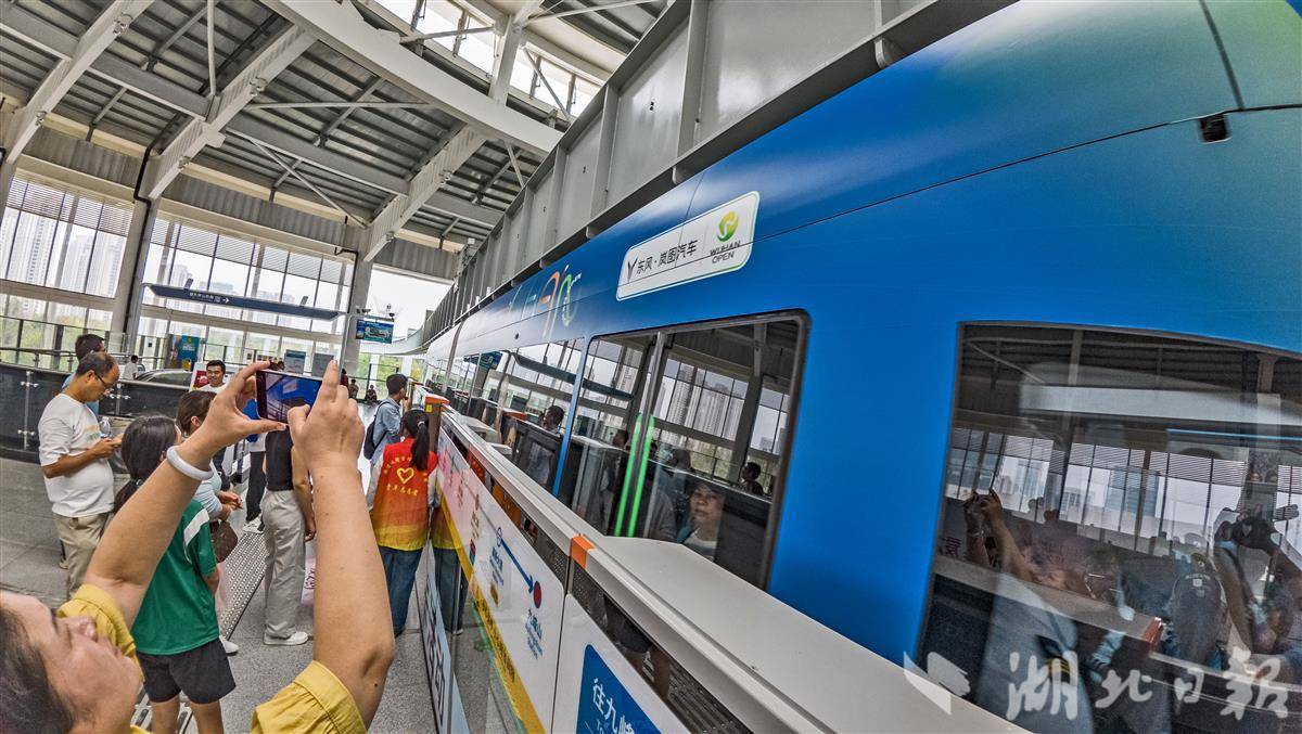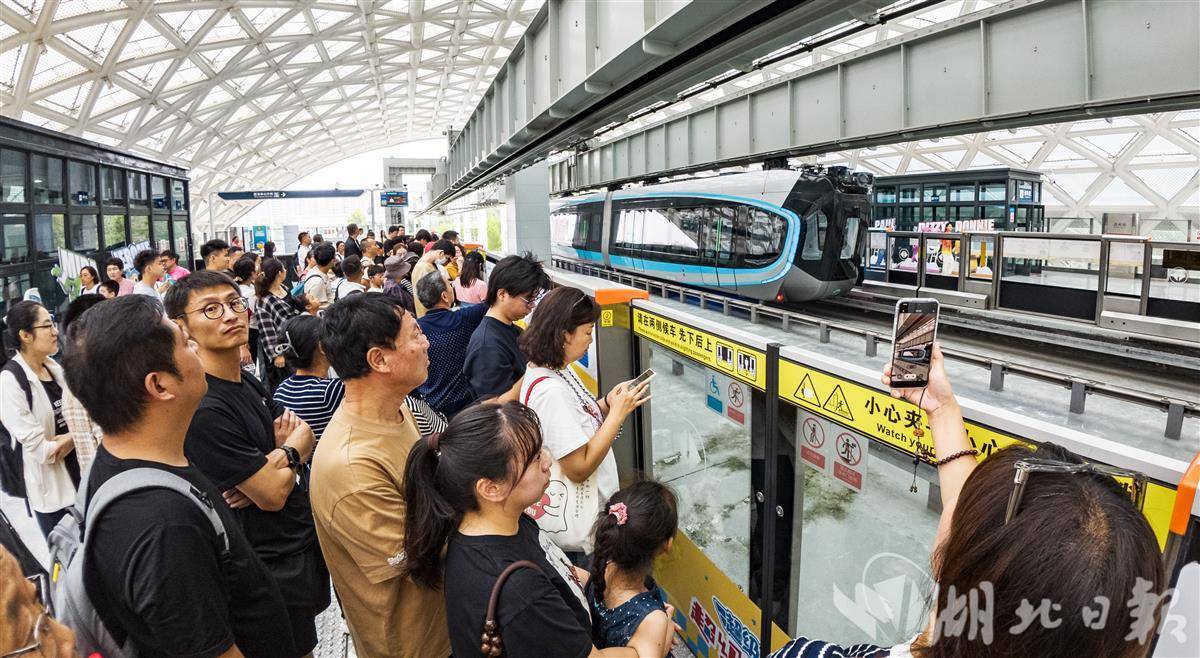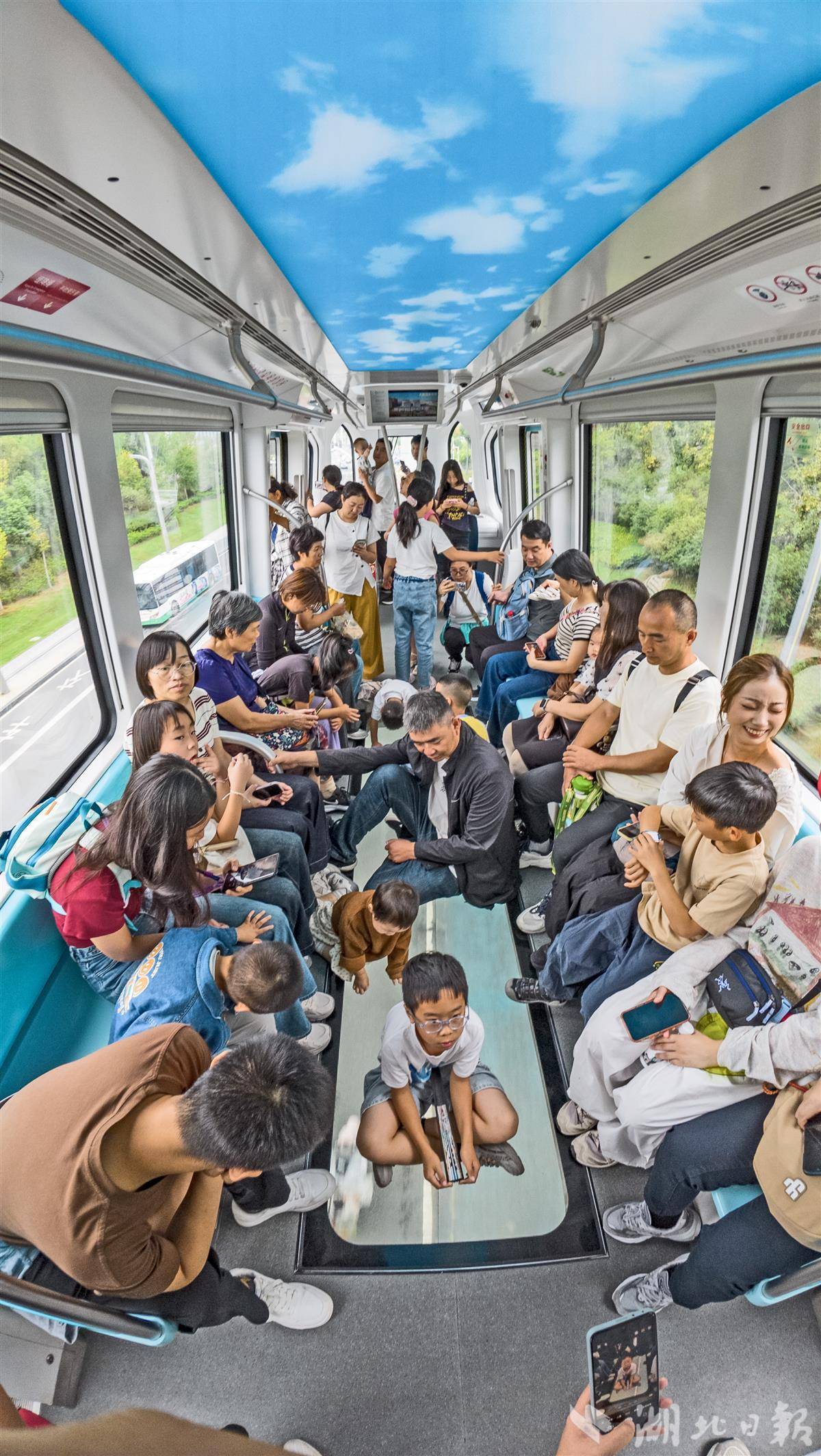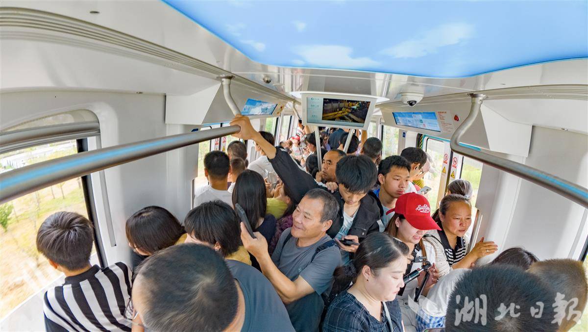 10月4日,武汉光谷空轨沿线站点人头攒动,来自全国各地的游客专程前来体验 “空中穿行” 的乐趣。在倒悬的 “光谷光子号” 车厢内,游客们或俯身透过透明地板观察下方道路与绿植,或凭窗透过 270 度全景窗捕捉秋日里的生态景致,孩童的惊呼与家人的笑声交织,现场氛围热闹鲜活。(湖北日报全媒记者 刘曙松 摄)