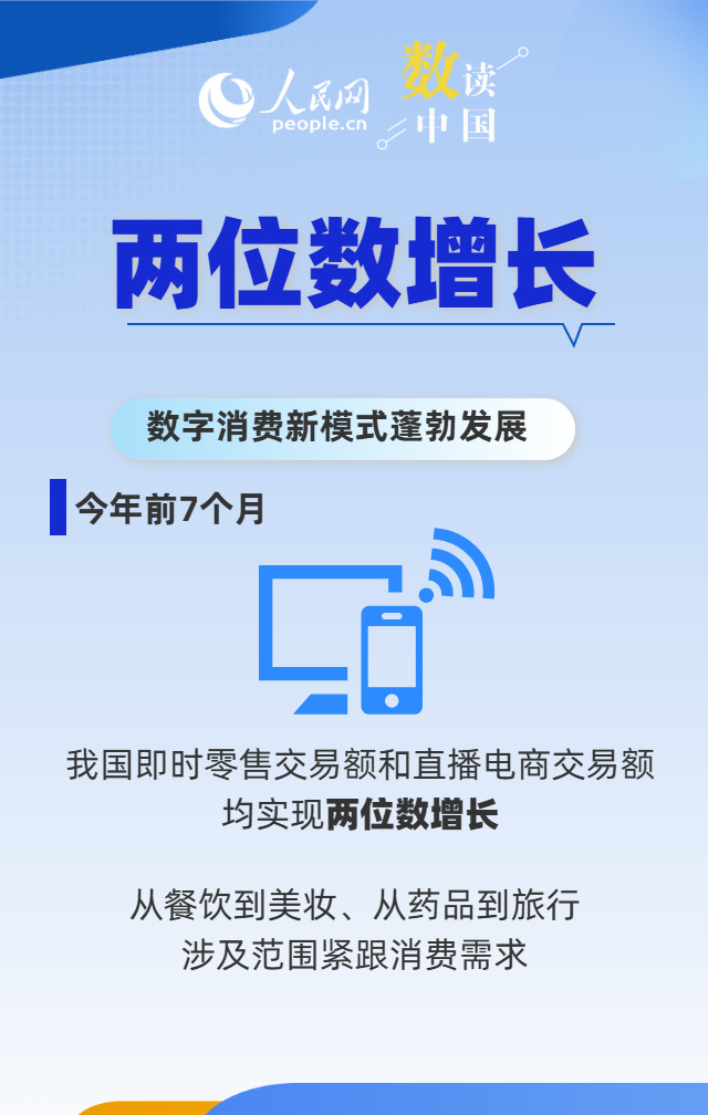 近日,商务部等8部门联合印发《关于大力发展数字消费共创数字时代美好生活的指导意见》,要求扩大数字消费多元化供给。今年以来,以5G、人工智能为代表的数字基础设施不断完善,消费场景持续拓宽,带动数字新消费蓬勃发展。我国发展数字消费潜力有多大?一组数据来看。