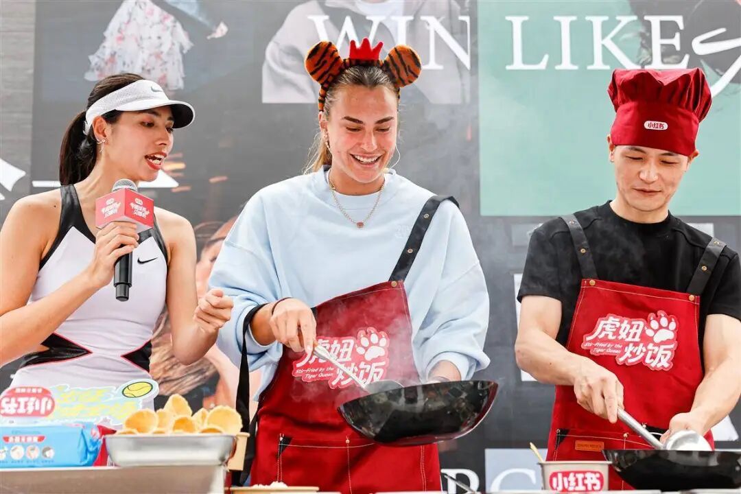 10月4日武网资格赛挥拍,又是萨巴伦卡在参赛球员中第一个举办专属球迷见面会,活动内容同样与“虎妞”的喜好同频——不是抱着球迷的宠物狗爱不释手,就是戴上老虎发卡、老虎手套、老虎尾巴等全套装备跳起“虎妞之舞”,最后,萨巴伦卡干脆“炒皇”上身,直接系上围裙为现场粉丝展示人生第一次炒饭。