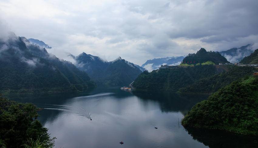 江坪河库水上涨,游客中心俯瞰江河大地,游船划破碧水,雪痕飞浪,水鸟翩翩起舞。来往车辆停车打卡,人们流连忘返。