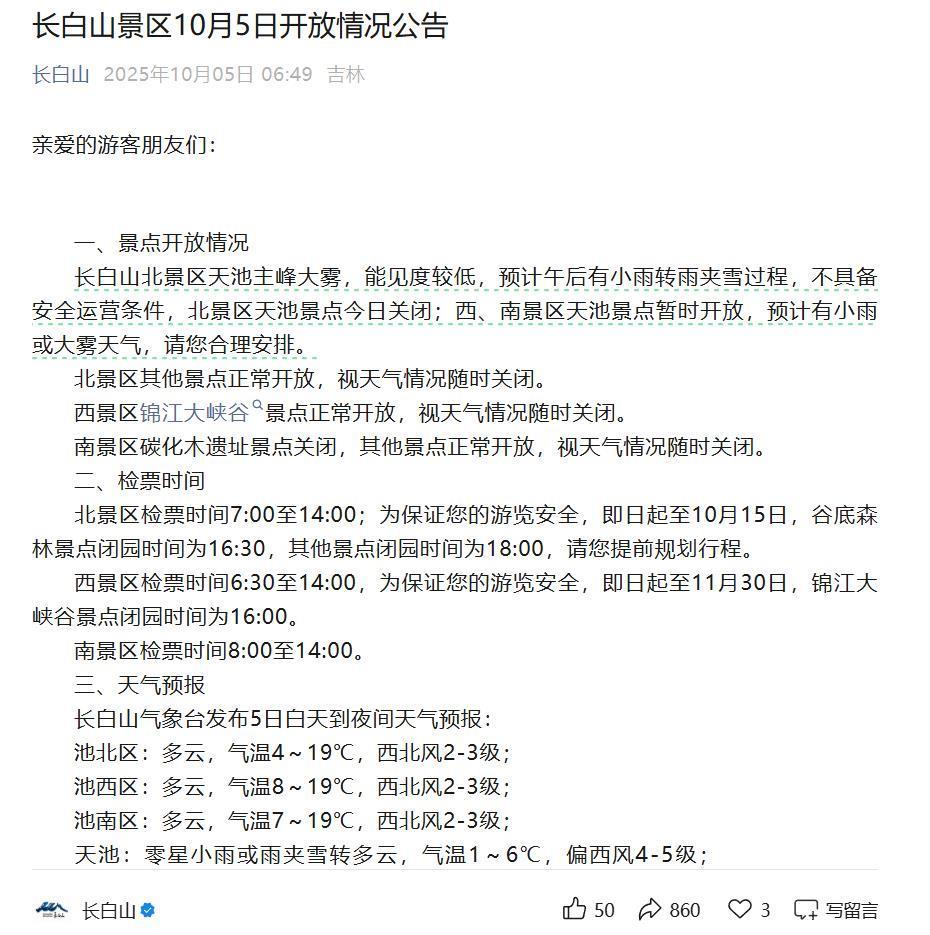 5日,极目新闻记者致电长白山景区,一名工作人员表示,景区每天都会发布开放情况公告,10月5日据工作人员现场观察,北景区天池主峰确实有大雾,下午还可能有雨夹雪,为了游客安全考虑,因此关闭了天池景点,购买了北景区门票的游客可以去谷底森林、绿渊潭等景点游玩。至于10月6日的开放情况如何,今天暂时还不清楚,可以留意明天的公告内容。