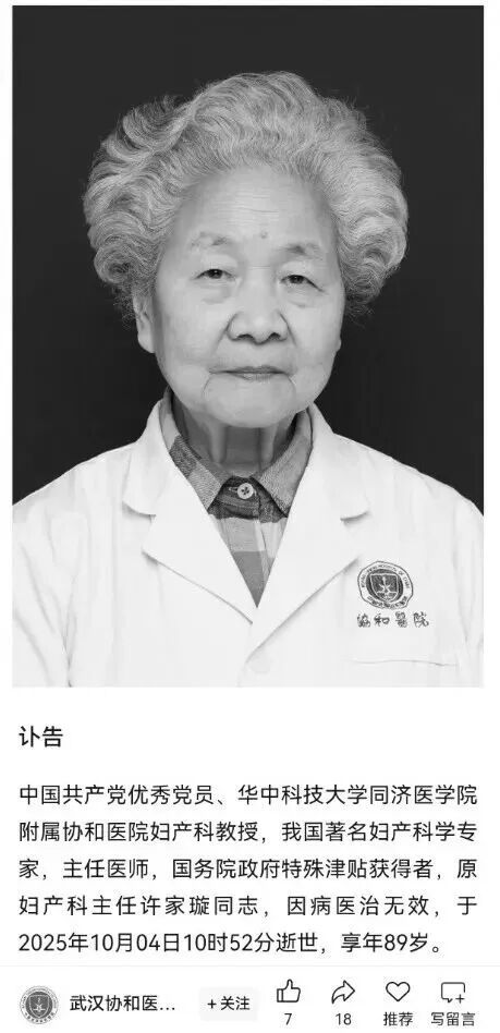 据华中科技大学同济医学院附属协和医院妇产科消息,中国共产党优秀党员、华中科技大学同济医学院附属协和医院妇产科教授,我国著名妇产科学专家,主任医师,国务院政府特殊津贴获得者,原妇产科主任许家璇同志,因病医治无效,于2025年10月04日10时52分逝世,享年89岁。