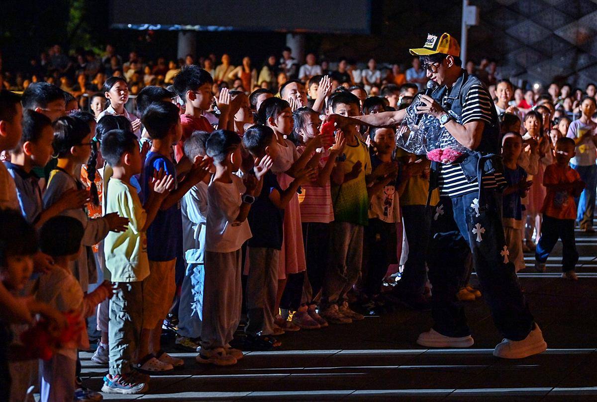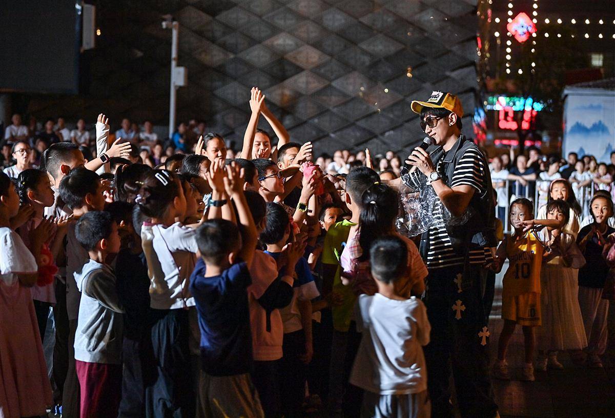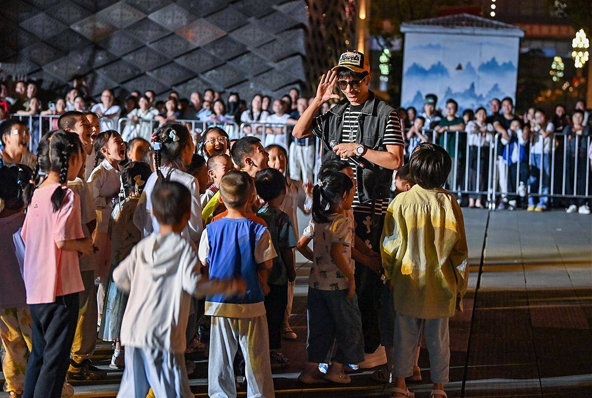 10月2日晚,武汉江夏区谭鑫培公园戏楼广场上,一名男歌手激情演唱引来众多市民的关注,特别是小朋友们,围着歌手为他呐喊助威,场面既温暖又热烈。近日,谭鑫培公园开展丰富多彩的文艺活动,成了市民就近寻乐、共庆佳节的“宝藏地”。(湖北日报全媒记者 朱熙勇 摄)