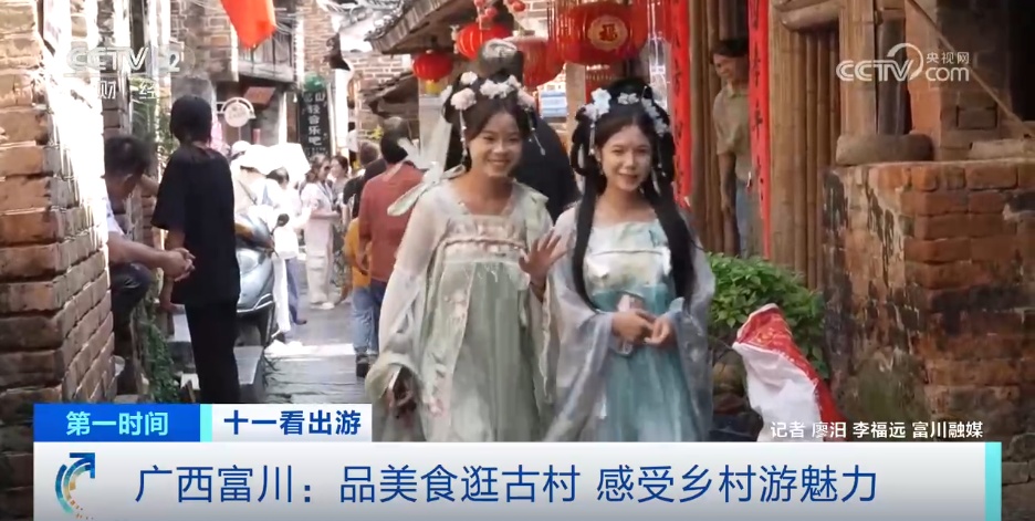 国庆中秋假期,广西富川瑶族自治县朝东镇岔山村迎来大批游客。人们漫步在古老的青石板路上,既能欣赏古树古宅、古道古桥,还能品尝地道的特色美食。古村里的民族服装租赁店生意红火。
