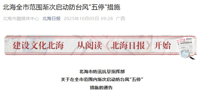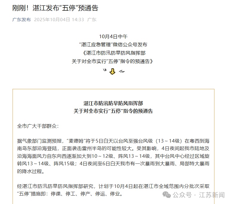 10月4日中午,广东湛江也发布了《湛江市防汛防旱防风指挥部关于对全市实行“五停”指令的预通告》