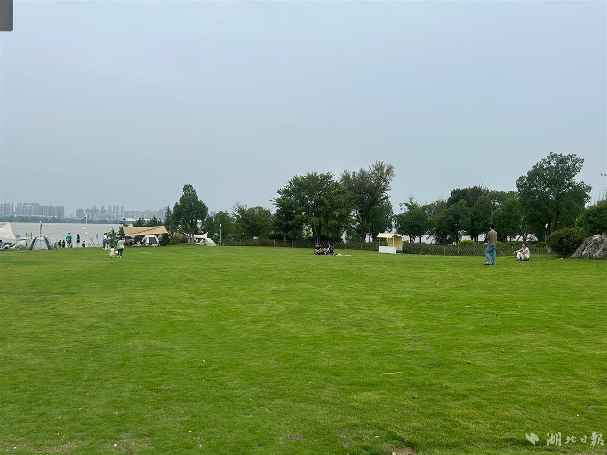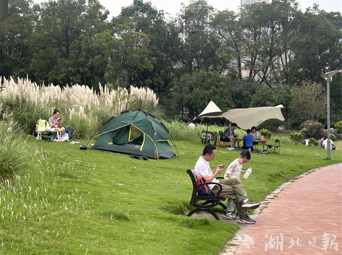 10月2日下午,湖北日报全媒记者来到青山江滩,沿着缓坡设计的步道前行,路两边随处可见搭着帐篷休闲的人们,有的是家庭聚会,孩子们在草坪上肆意奔跑,家长围在一起聊家长里短。有的是朋友相聚,天幕下好友们围坐在一起打牌、玩游戏,不时传来一阵阵爽朗的笑声。