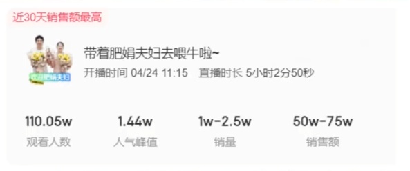 此前,肥娟夫妇开启了第一次直播带货,第三方平台数据显示,肥娟夫妇首场带货直播了5个小时,销量1万-2.5万,销售额50万-75万。