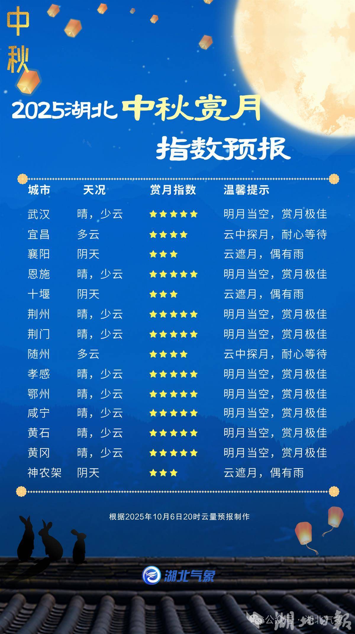 临近中秋,天公作美,一轮备受瞩目的“超级月亮”将点亮夜空。预计中秋之夜(10月6日夜间),鄂东南、鄂东北、江汉平原、鄂西南西部等地天气晴朗,能见度高,天气利于赏月;宜昌、随州两地以多云为主,需耐心等待月亮探云而出;鄂西北一带云量较多,部分地区有阵性降水,对赏月有一定影响。由于昼夜温差拉大,公众应留意气温变化,及时调整着装,建议采取“洋葱式”穿衣法。夜间鄂西北以及高海拔地区较为寒凉,气温在20℃以下,户外活动请注意适时增添衣物,以防感冒。山区夜间外出赏月还需注意脚下安全。