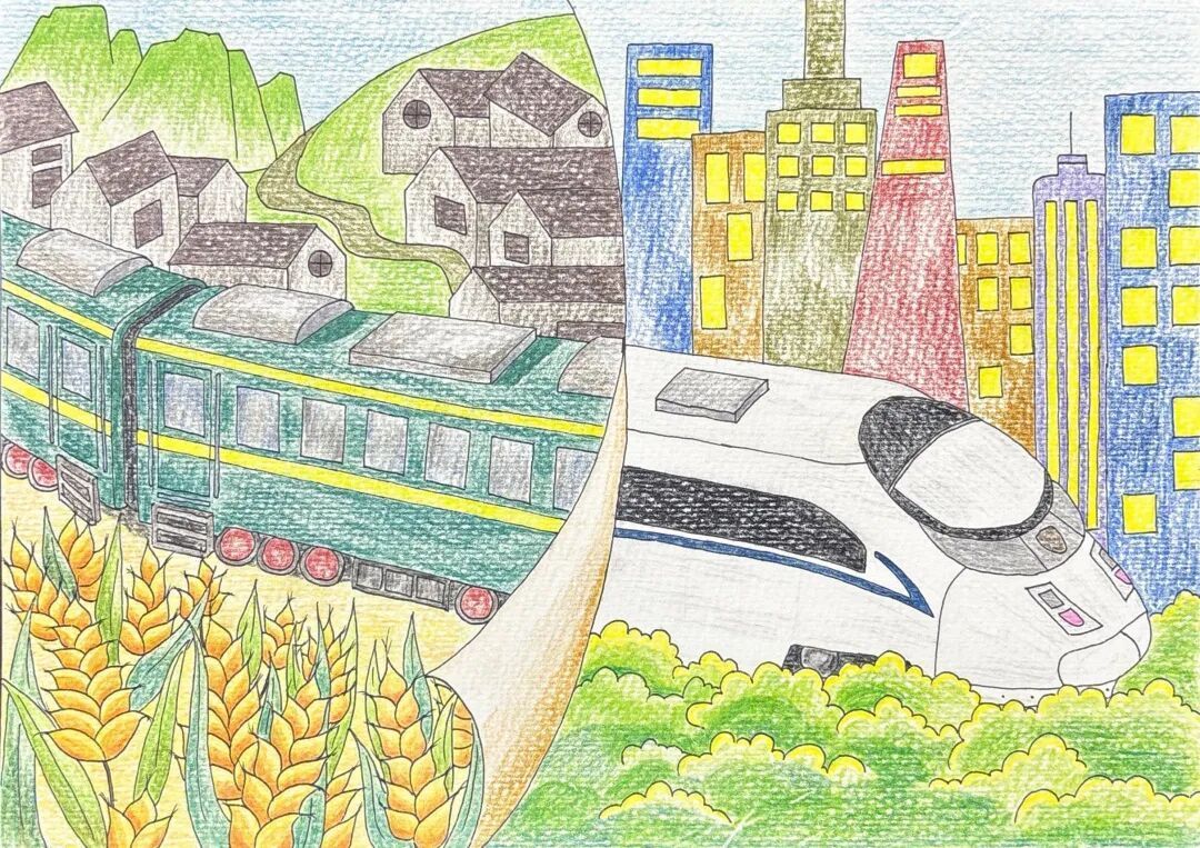 铁路的那一端,是我爸爸妈妈小时候生活的地方,是我亲爱的爷爷奶奶、外公外婆的家。每到假期,我和爸爸妈妈就会坐火车回趟老家。一路上,我坐在车窗边,看着窗外的风景慢慢变化:高楼变成了田野,马路变成了小河,还有一块块绿油油的稻田在风中轻轻摇摆,就像在向我们打招呼。我问妈妈:“你小时候是不是走过这条路?”妈妈点点头,眼睛里有笑意也有回忆。我想,那一定是个温暖和阳光的童年。