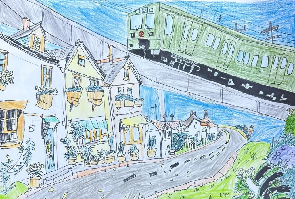 铁路的这端,是我现在生活的家。我在这里上学、写作业、和小伙伴玩耍。每天早上,我吃完早饭,就能听到“呜——”的火车鸣笛,好像在对我说:“早上好啊,小朋友,今天也要加油!”到了晚上,火车在夜色中慢慢驶过,它的声音低低的、轻轻的,像妈妈唱的摇篮曲,让我听着听着就进入了甜甜的梦乡。