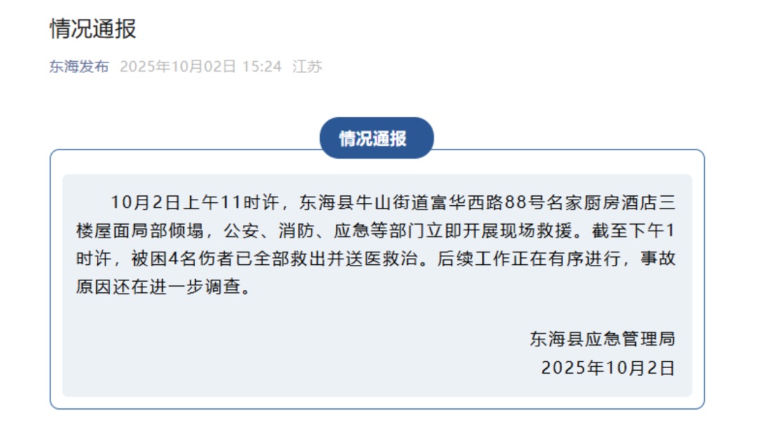 10月2日上午11时许,东海县牛山街道富华西路88号名家厨房酒店三楼屋面局部倾塌,公安、消防、应急等部门立即开展现场救援。截至下午1时许,被困4名伤者已全部救出并送医救治。后续工作正在有序进行,事故原因还在进一步调查。