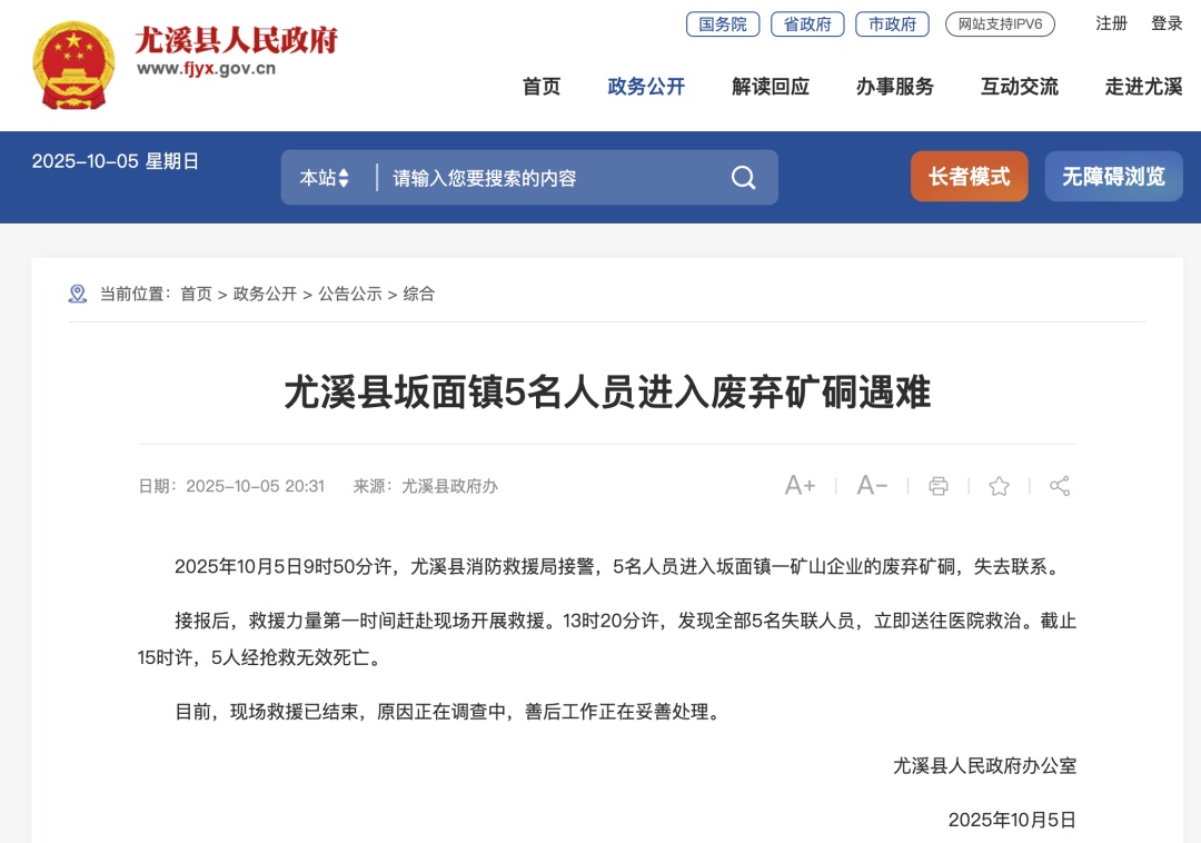 10月5日,据福建省三明市尤溪县政府网站消息,2025年10月5日9时50分许,尤溪县消防救援局接警,5名人员进入坂面镇一矿山企业的废弃矿硐,失去联系。