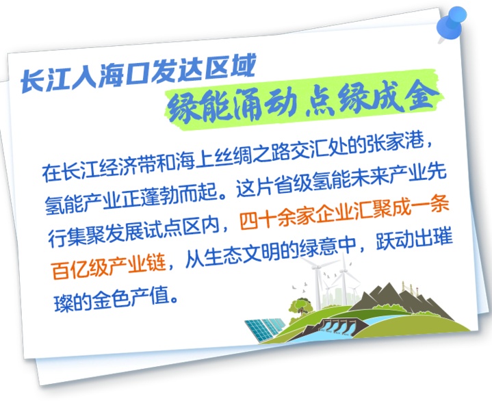 离开张家港湾,沿着长江岸线一路向北,翠绿的岸线与澄澈的江面交相辉映,另一派繁忙景象也映入眼帘——在张家港港集装箱码头,货轮在泊位上有序装卸作业,一辆辆氢燃料牵引车在堆场往来穿梭......