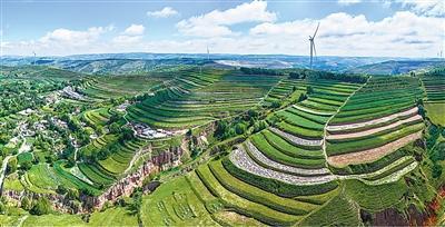 在甘肃定西通渭县马营镇,经过系统治理,黄土高原上的层层梯田风景如画。