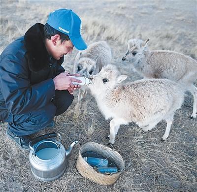 青海三江源国家公园管理局长江源园区可可西里管理处索南达杰保护站,巡山队员给被救助的藏羚羊幼仔喂奶。