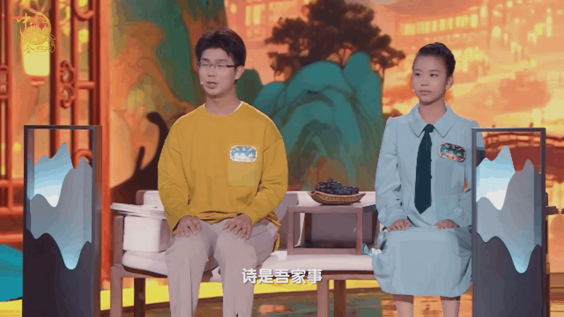 第一组是由田大地、田文地兄妹组成的“通文达艺”组合。兄妹二人曾多次参与诗词类节目,今年哥哥田大地已考入中国人民大学,妹妹田文地也从小学生成长为一名初中生。他们的口号是:“诗是吾家事,人传世上情。”