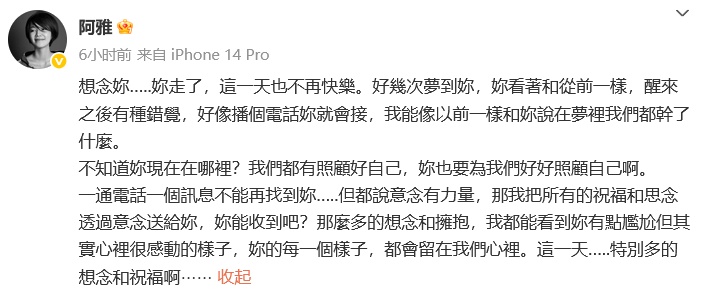 10月6日,主持人、歌手、演员柳翰雅发文想念大S:“想念你……你走了,这一天也不再快乐。好几次梦到你,你看着和从前一样,醒来之后有种错觉,好像播个电话你就会接,我能像以前一样和你说在梦里我们都干了什么。