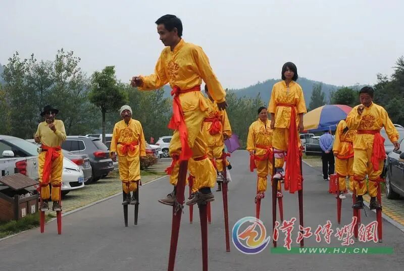 2012年10月4日,南漳县东巩镇春秋寨景区,民间艺人正在为游客表演高跷。晏光辉摄