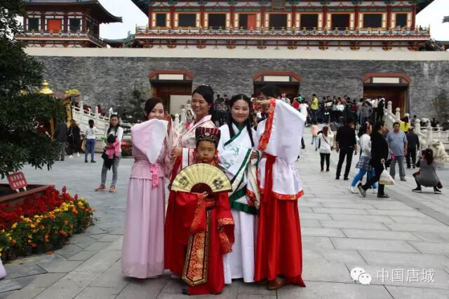 2015年“十一”黄金周,在襄阳盛世唐城景区,游客们身着唐装一秒变“唐人”,感受地道唐风古韵的歌舞演艺。