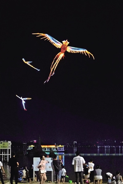 昨晚的东湖,九架凤凰造型航模齐齐腾空,翅翼流光溢彩,仿佛神话中的神鸟真的翱翔于东湖夜空。为游客奉上传统与科技相融合的中秋祝福。
