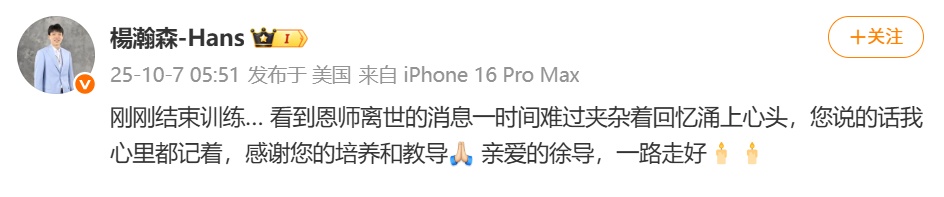 杨瀚森今晨发文缅怀:“刚刚结束训练……看到恩师离世的消息,一时间难过夹杂着回忆涌上心头,您说的话我心里都记着,感谢您的培养和教导。亲爱的徐导,一路走好️️。”