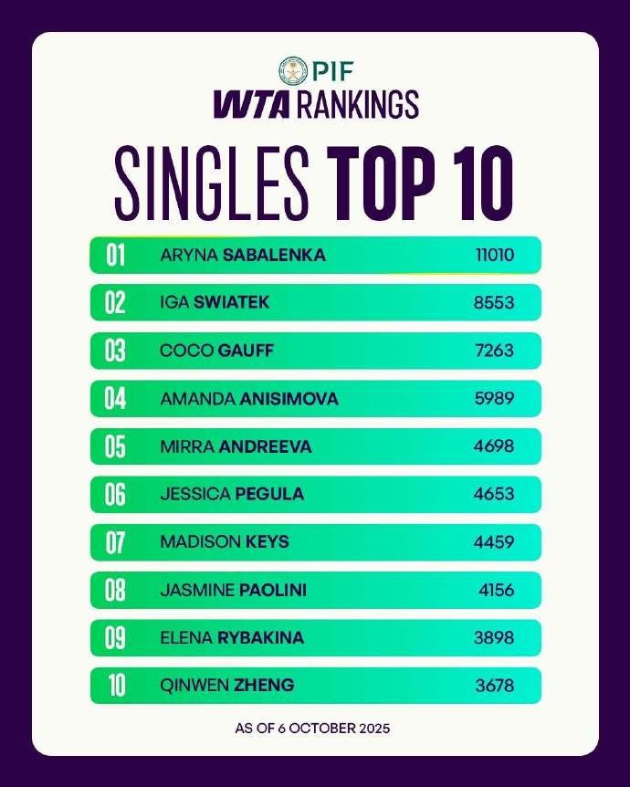 10月7日,@WTA国际女子网球协会 更新本周TOP20球员的排名和积分情况,中国选手郑钦文的排名下降至第10位。