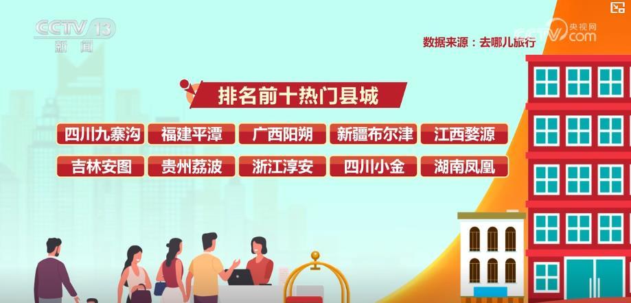 平台数据显示,10月1日—6日,全国近2000个县城的酒店和民宿迎来各地游客,排名前十的热门县城有四川九寨沟、福建平潭、广西阳朔、新疆布尔津、江西婺源、吉林安图、贵州荔波、浙江淳安、四川小金、湖南凤凰。