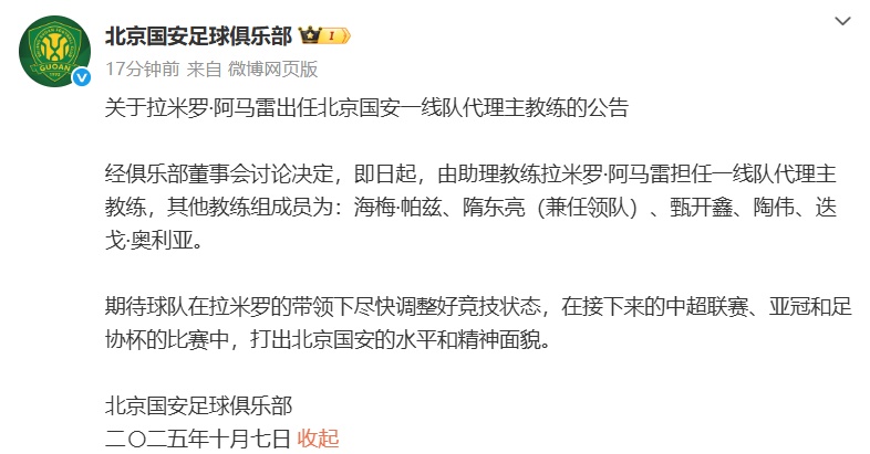 刚刚,@北京国安足球俱乐部 发布关于拉米罗·阿马雷出任北京国安一线队代理主教练的公告: