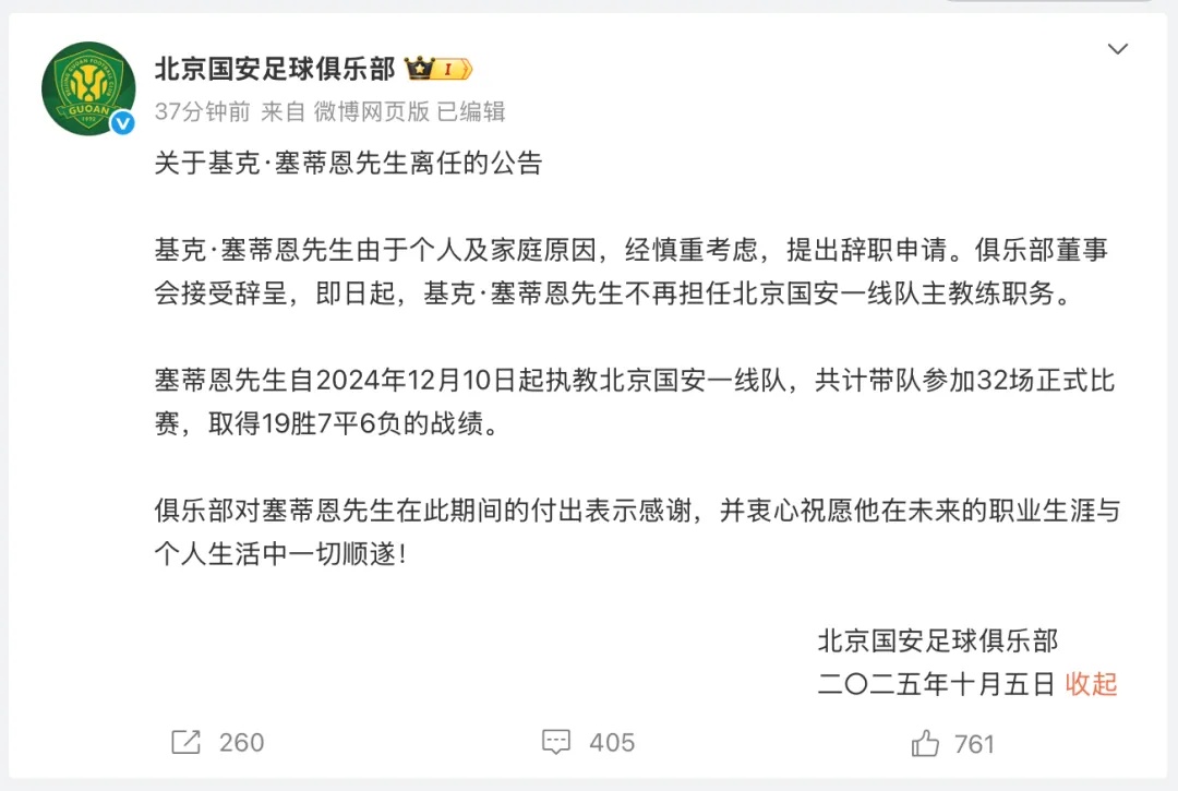 10月5日晚,@北京国安足球俱乐部 宣布基克·塞蒂恩辞职,不再担任北京国安一线队主教练职务。